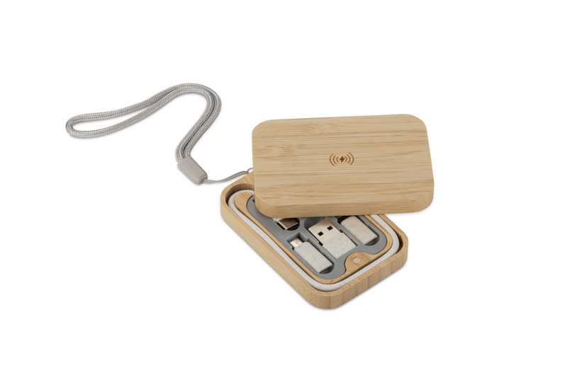 Zestaw kabli BUMO to praktyczne i wielofunkcyjne akcesorium do ładowania, umieszczone w estetycznym etui z bambusa. Oprócz klasycznych kabli, zestaw wyposażono w funkcję ładowarki bezprzewodowej w standardzie Qi Wireless o mocy 10 W, co pozwala wygodnie zasilać kompatybilne urządzenia. Kable wykonane z tworzywa ze słomy pszennej oferują zarówno funkcję ładowania, jak i obsługę przesyłu danych, a wyjście o mocy do 15 W zapewnia szybkie działanie. Dzięki złączom USB-C zestaw sprawdzi się w przypadku większości nowoczesnych urządzeń mobilnych. Kompaktowe etui ułatwia przechowywanie i transport, dzięki czemu BUMO idealnie nadaje się do codziennego użytku w biurze i w podróży. Możliwość znakowania sprawia, że to również ciekawy gadżet reklamowy z praktycznym zastosowaniem.