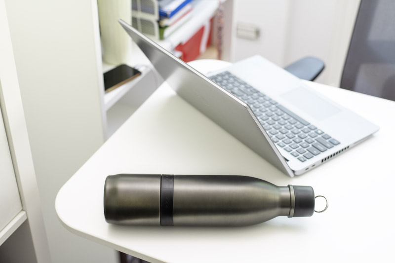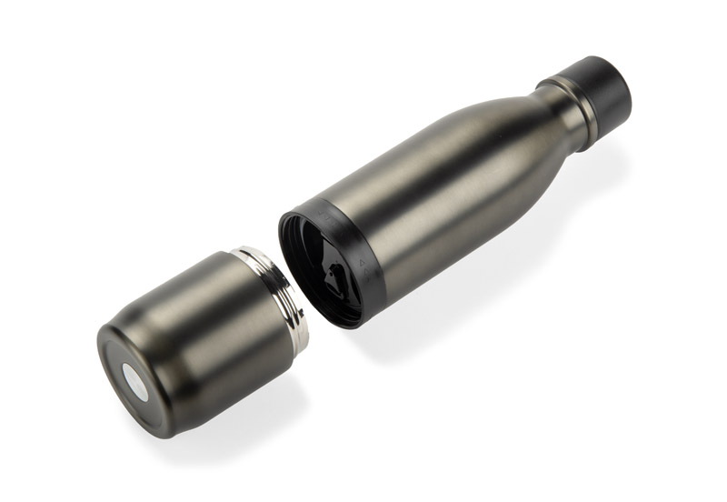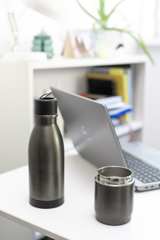 Butelka termiczna DRINNO ze stali nierdzewnej składa się z dwóch elementów (komór), które można rozdzielić i używać niezależnie. Górna część to butelka termiczna z zakrętką wyposażoną w składany uchwyt (500 ml), a dolna część to odkręcany kubek termiczny z pokrywką zamykaną na zatrzask (ok. 200 ml). Całość tworzy funkcjonalne rozwiązanie do przechowywania ciepłych i zimnych napojów – idealne do pracy, w podróży lub jako praktyczny upominek reklamowy.