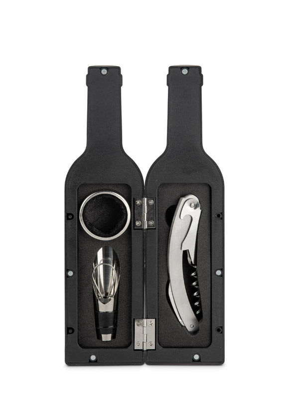 Zestaw do wina SOMMELIER w etui w kształcie butelki to praktyczny i stylowy upominek reklamowy. W jego wnętrzu znajdują się niezbędne akcesoria: nóż kelnerski, nalewak oraz obręcz zapobiegająca kapaniu. Kompaktowa forma ułatwia przechowywanie i nadaje zestawowi oryginalny charakter. Doskonały jako prezent dla klientów, partnerów biznesowych lub dodatek do zestawu prezentowego z winem.