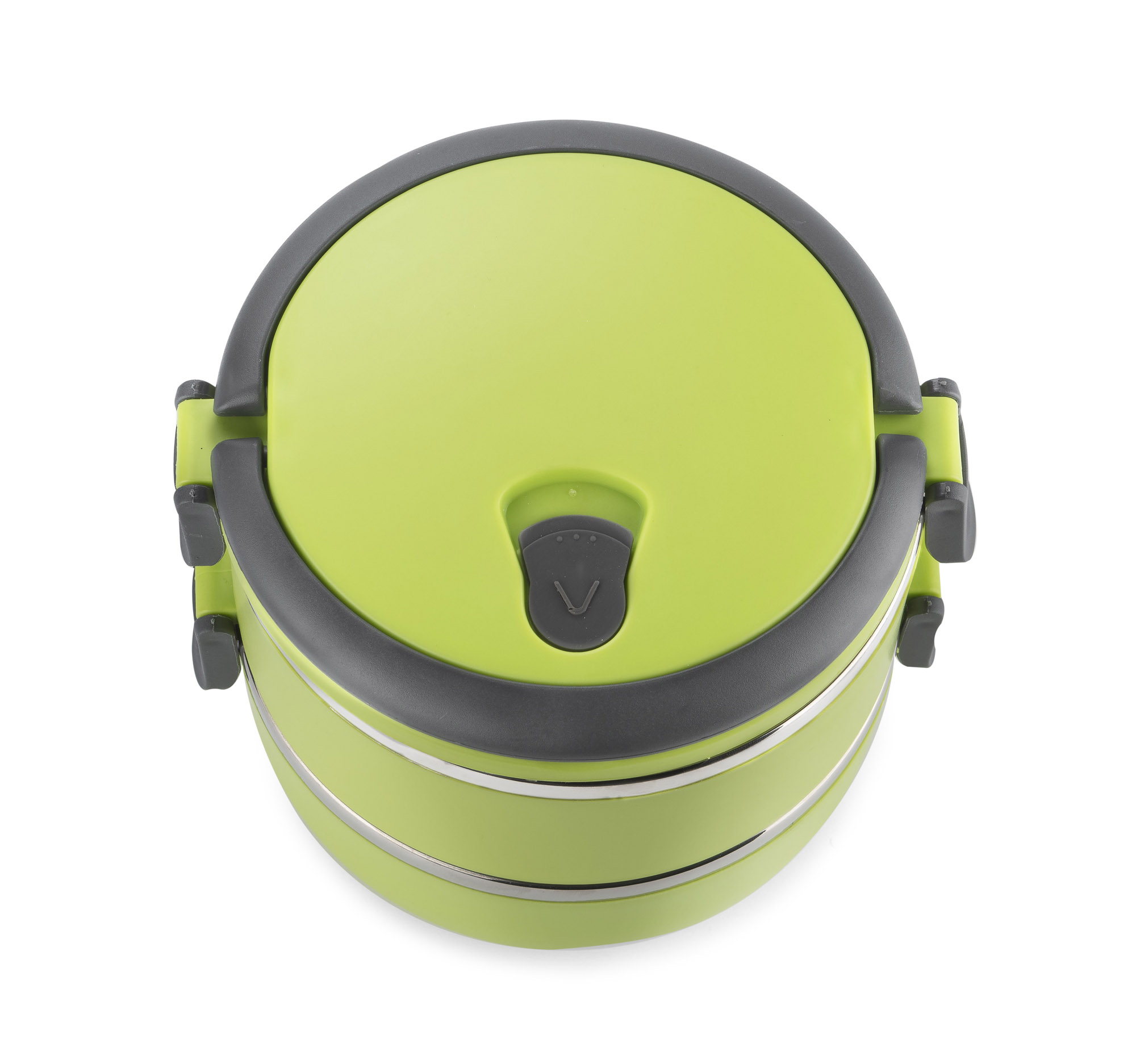 Pojemnik z wnętrzem ze stali nierdzewnej podzielony na dwie komory, które składamy jedną na drugą, co zapewnia poręczne i wygodne przenoszenie dwudaniowych posiłków. Górna komora wyposażona w uszczelkę. Uchwyty z tworzywa sztucznego z możliwością złożenia. Łączna pojemność: 1400 ml.