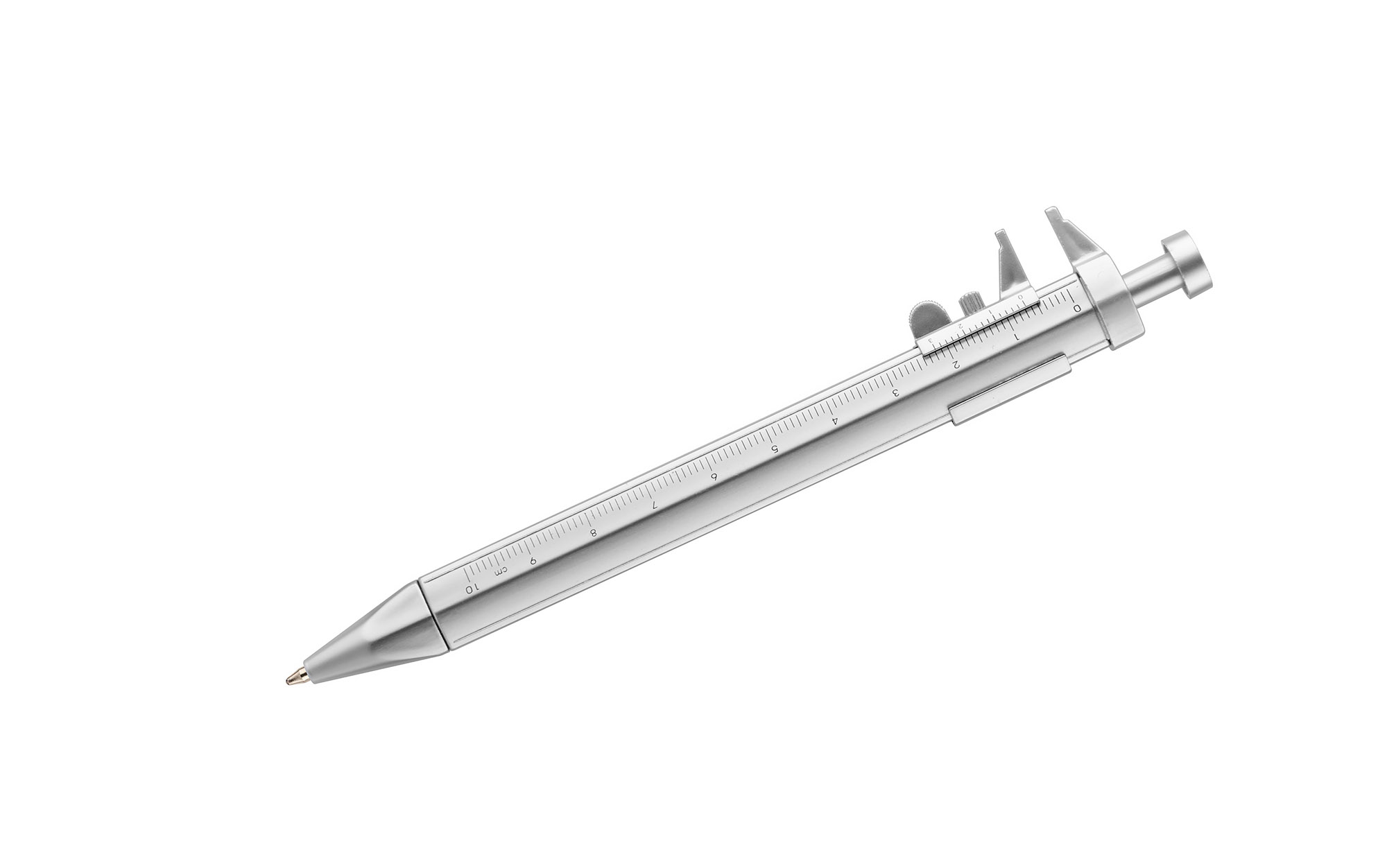 Wyjątkowo praktyczny długopis automatyczny METRUM z funkcją mini suwmiarki o długości miarki 10 cm. Wykonany jest z tworzywa. Wkład w kolorze niebieskim. Logo nadrukujemy na powierzchni długopisu.