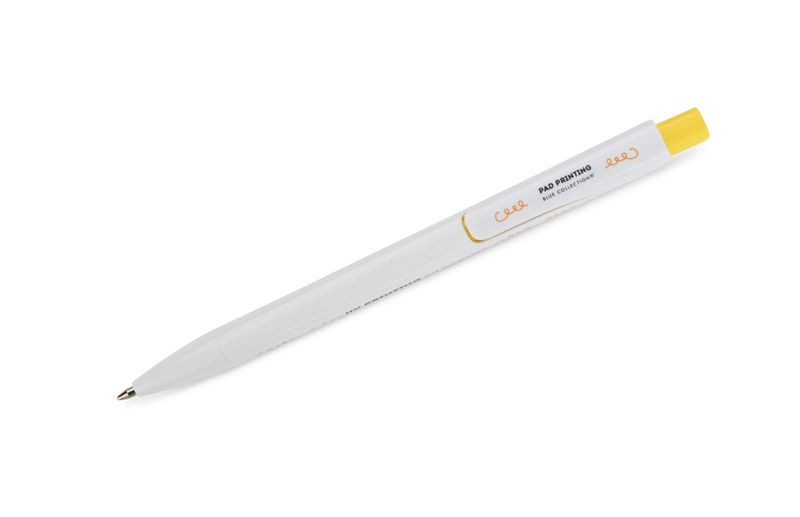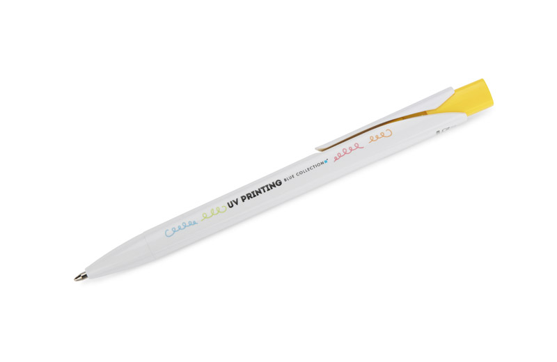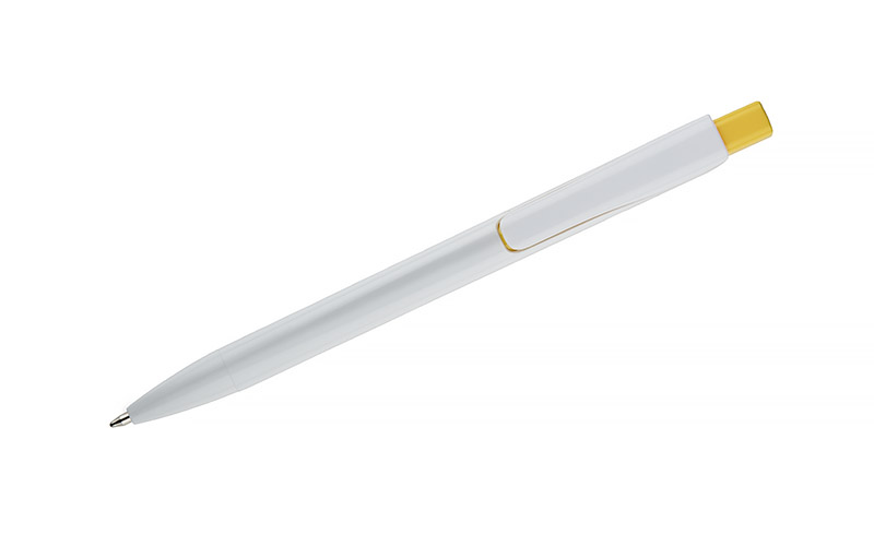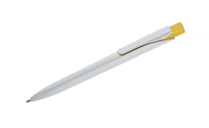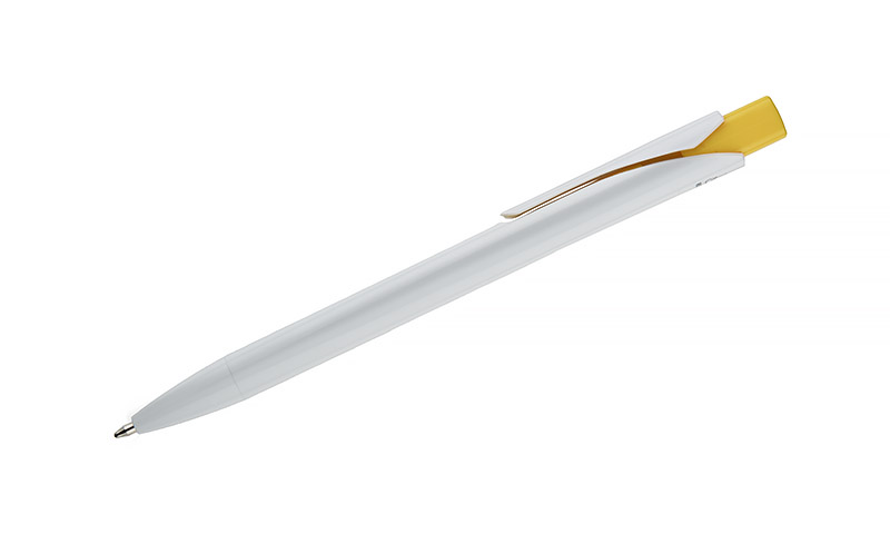Długopis KLIBO wykonany jest z tworzywa rABS w klasycznym białym kolorze, z lakierowanym wykończeniem. Wyróżnia go kwadratowy, kolorowy przycisk oraz wąski, płaski klip, który pewnie trzyma się dokumentów i notesów. Mechanizm automatyczny zapewnia wygodne użytkowanie, a wkład typu G2 o grubości pisania 1,0 mm gwarantuje płynny i równy zapis. Lekka konstrukcja i nowoczesna forma sprawiają, że KLIBO to praktyczny gadżet reklamowy do codziennego użytku.