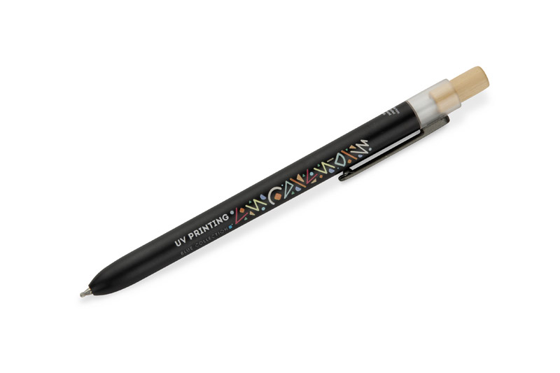 Długopis OCEANO wykonany jest z materiału pochodzącego z odpadów ocean bound – tworzyw zbieranych z terenów przybrzeżnych, zanim trafią do mórz i oceanów. Posiada lakierowany korpus, bambusowy przycisk oraz metalowy klips, co nadaje mu nowoczesny wygląd i przyjemne w użytkowaniu wykończenie. Automatyczny mechanizm ułatwia codzienną obsługę, a wkład typu G2 z żelowym tuszem o grubości pisania 0,5 mm zapewnia płynny i precyzyjny zapis.