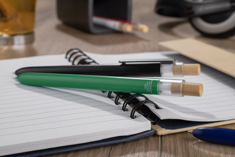 Długopis OCEANO wykonany jest z materiału pochodzącego z odpadów ocean bound – tworzyw zbieranych z terenów przybrzeżnych, zanim trafią do mórz i oceanów. Posiada lakierowany korpus, bambusowy przycisk oraz metalowy klips, co nadaje mu nowoczesny wygląd i przyjemne w użytkowaniu wykończenie. Automatyczny mechanizm ułatwia codzienną obsługę, a wkład typu G2 z żelowym tuszem o grubości pisania 0,5 mm zapewnia płynny i precyzyjny zapis.