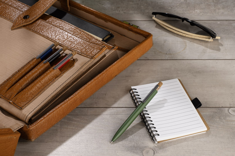 Długopis KORIN wykonany jest z recyklingowanego aluminium i pokryty lakierowanym wykończeniem, które nadaje mu gładką, satynową powierzchnię. Wyposażony w automatyczny mechanizm, wkład typu G2 o grubości pisania 1,0 mm oraz metalowy klips w kolorze grafitowym. Korkowy przycisk stanowi ciekawy akcent, podkreślający nowoczesny charakter długopisu. KORIN jest lekki, solidny i wygodny w codziennym użytkowaniu.