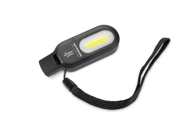 Latarka WISLI to praktyczne akcesorium 2 w 1 – połączenie lampki i gwizdka, które sprawdzi się podczas spacerów, podróży czy aktywności na świeżym powietrzu. Wyposażona w dwa tryby świecenia – ciągły i pulsujący – zapewnia dodatkowe źródło światła oraz możliwość sygnalizacji. Zasilana jest trzema wymiennymi bateriami AAA (brak w zestawie), co pozwala łatwo przygotować ją do pracy. Dzięki lekkiej konstrukcji i dołączonej czarnej smyczy można mieć ją zawsze pod ręką. To gadżet reklamowy, który zyskuje indywidualny charakter dzięki opcji znakowania logo.