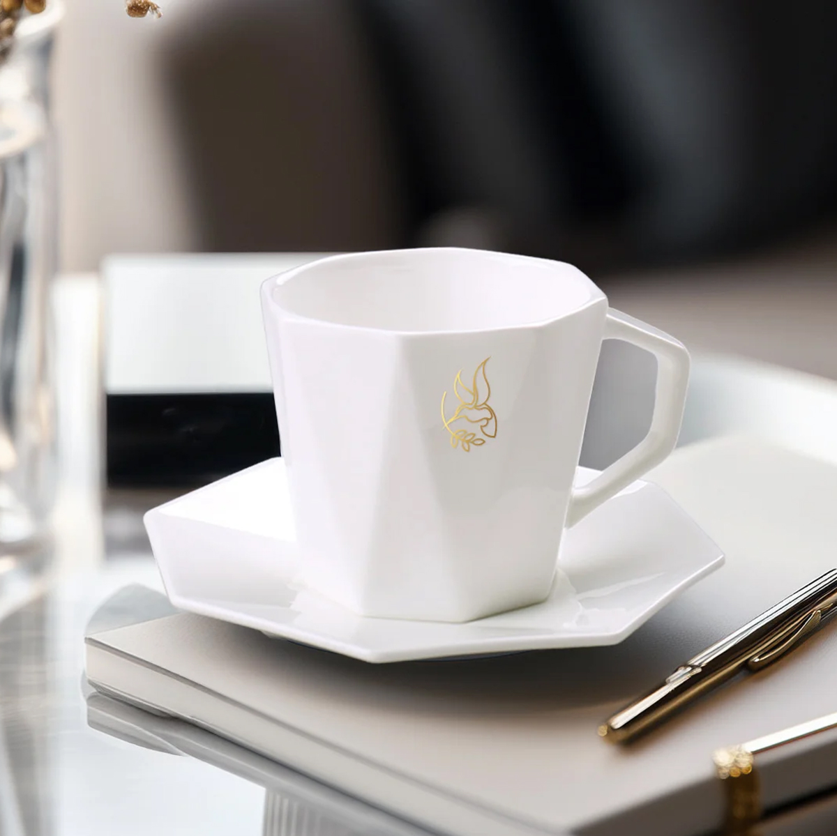 Piękna geometryczna filiżanka wykonana z najwyższej jakości porcelany Fine Bone China. Posiada idealnie dopasowany spodek. Należy do linii Prestige Line. Idealna w duecie z kubkiem Tiara.