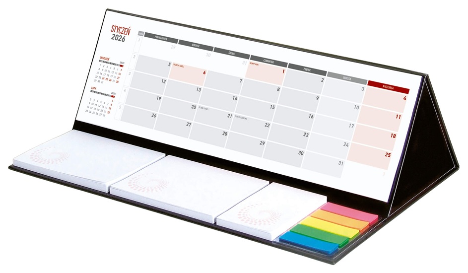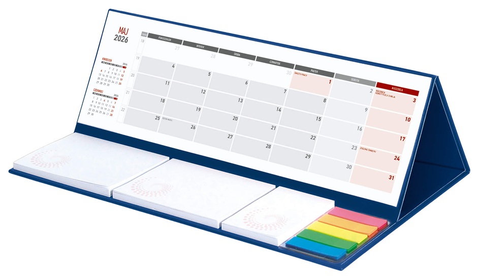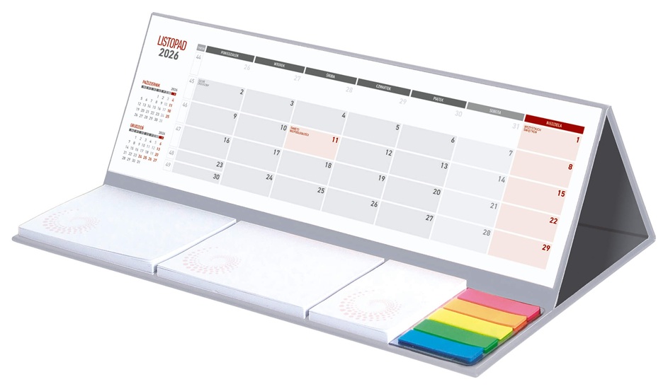 Wygodny kalendarz stojący na biurko z przejrzystym kalendarium w układzie trójdzielnym z poręcznymi karteczkami samoprzylepnymi do notowania. Przydatny zwłaszcza w biurze. W kalendarzu zaznaczono święta i daty imienin. Na tylnej części kalendarza istnieje możliwość wykonania nadruku reklamowego na obszarze o wymiarach 305 x 100 mm.
