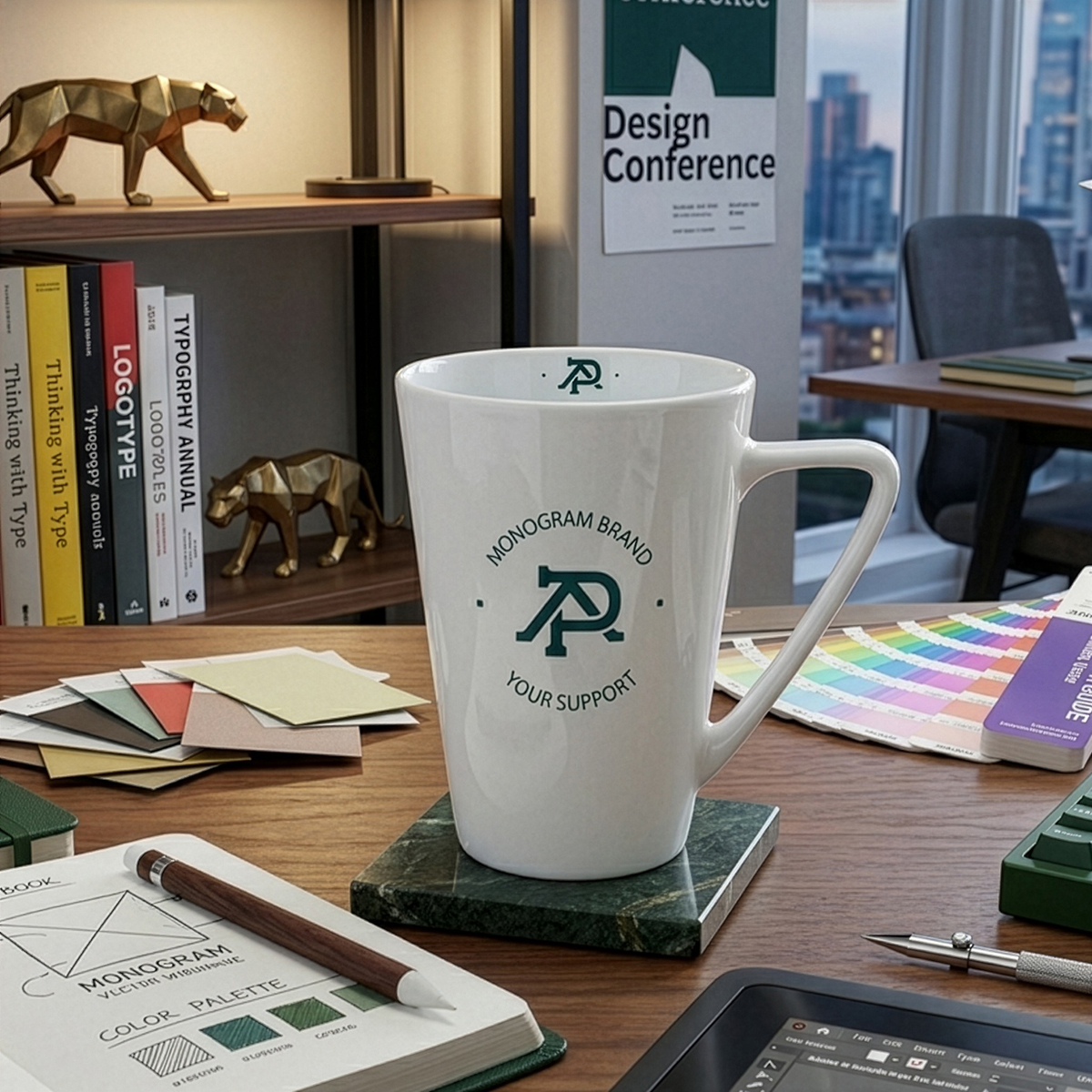 Pojemny kubek o geometrycznym kształcie korpusu i ucha. Wykonany z wysokiej jakości porcelany. Idealny do nanoszenia obszernych zdobień.