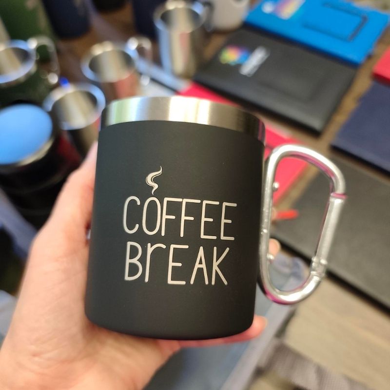 Kubek ze stali nierdzewnej o podwójnych ściankach, o przyjemnej w dotyku powierzchni. Kubek posiada uchwyt w formie karabińczyka. Pojemność: 300 ml.