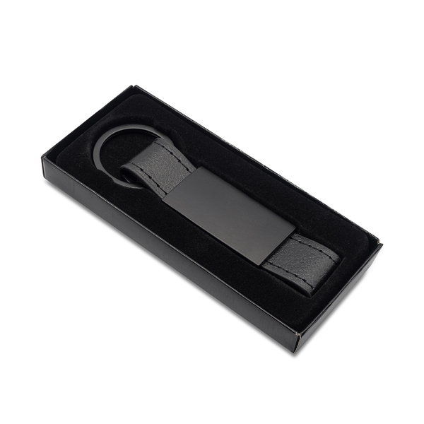 Elegancki brelok o czarnej matowej powierzchni. Pakowany w czarne pudełko upominkowe.