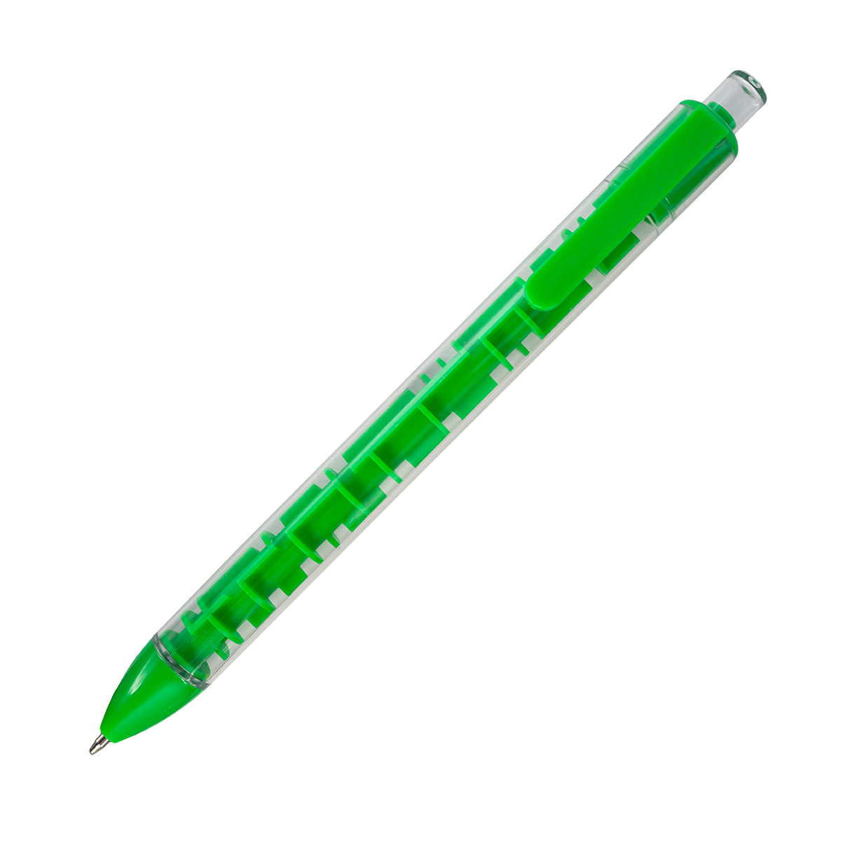 Oryginalny długopis z przezroczystym korpusem i wbudowanym labiryntem z dwiema metalowymi kulkami. Wkład w kolorze niebieskim.